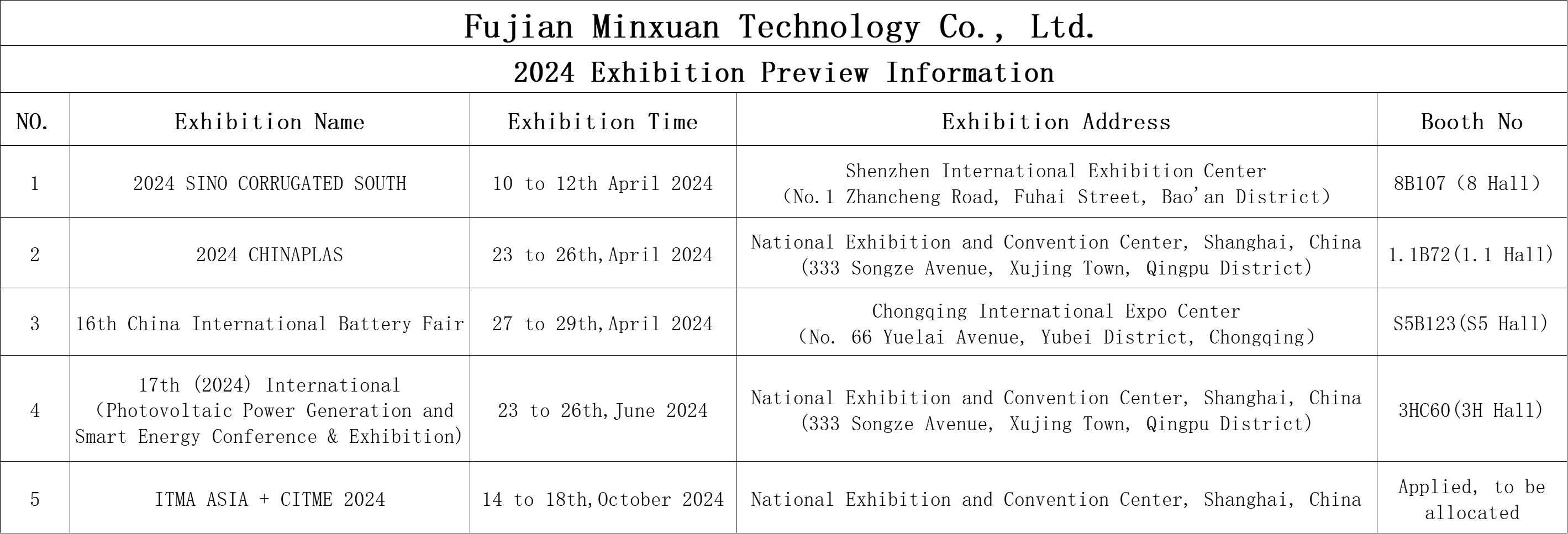 Dear customers and friends: The following is the exhibition information of our company's Minxuan Technology in 2024. At that time, we sincerely invite you to visit the company's booth for guidance.