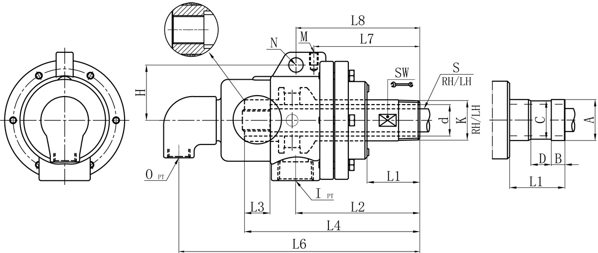 | Model | K | I | O | S | d | L1 | L2 | L3 | L4 | L6 | L7 | L8 | M | N | H | SW | 法蘭式外管尺寸對照表 | |||